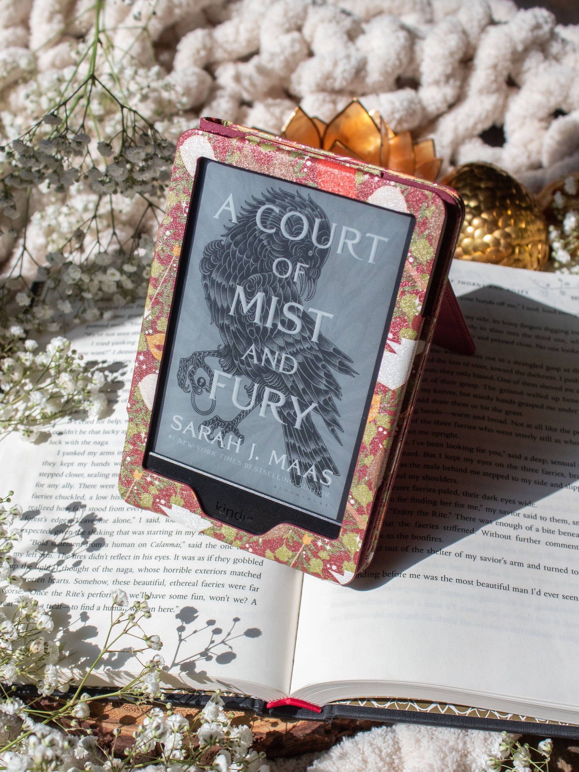 Designed with readers in mind, this kindle case offers protection for your Kindle and puts the fun in functional with bookish designs. It features a convenient kick stand for hands-free reading, a secure hand strap, and an automatic sleep/wake feature. Plus, keep your essentials close with the card holder slot. Never compromise on style or functionality with our Kindle case! Details: Vegan Leather Magnetic Closure Sleep/ Wake Stretch Hand Strap Card Holder Slot Kick Stand Designed in KS / Imported Care Instructions: Spot clean with a damp cloth. Do not use alcohol based cleaners. From A Court of Thorns and Roses, by Sarah J. Maas, © 2022. Artwork by Meagan Mathison; Created with permission of Writers House LLC acting as agent for the author.