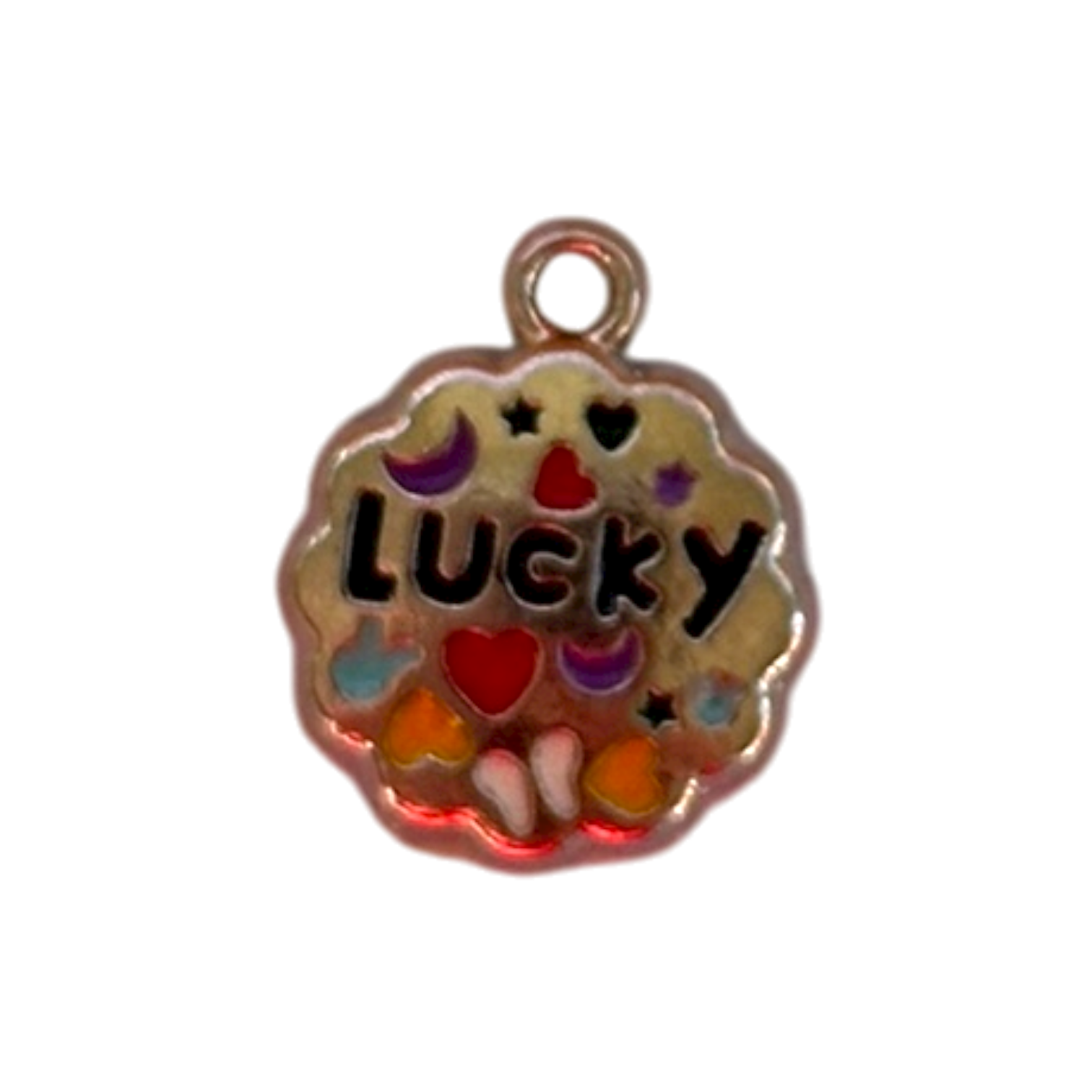 Stainless steel round charm with ‘lucky’.