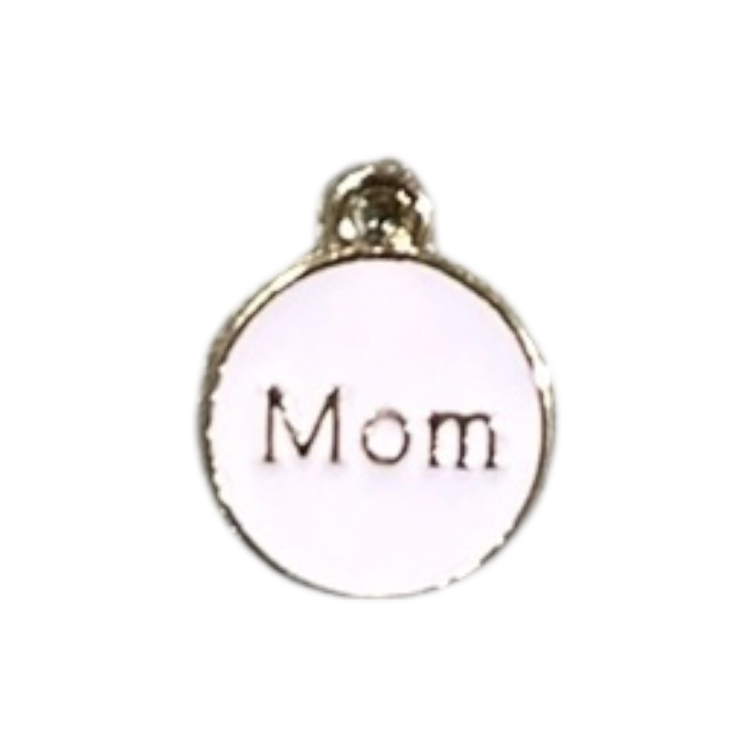 Gold plated circle charm with light pink enamel surrounding 'Mom'.