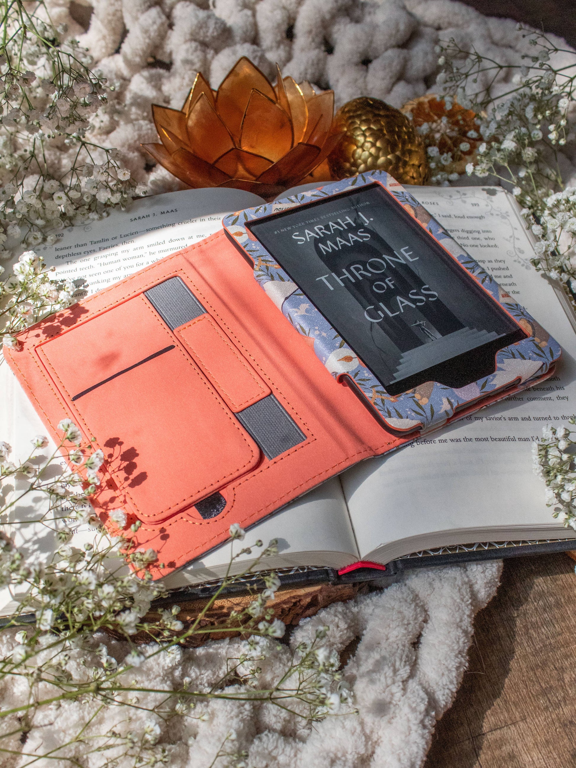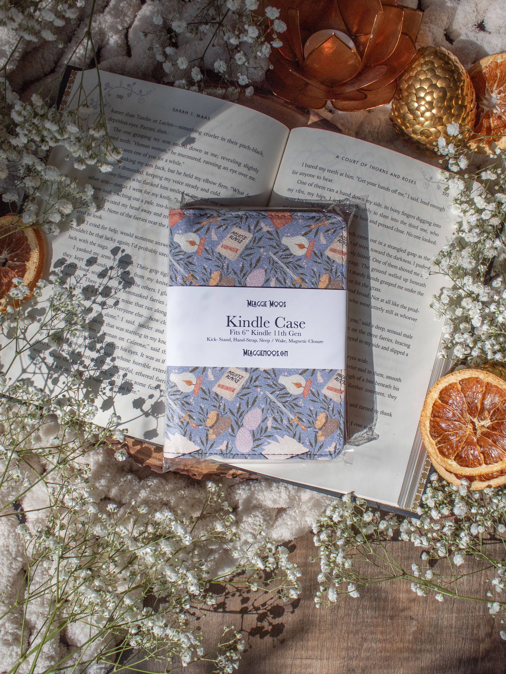 Designed with readers in mind, this kindle case offers protection for your Kindle and puts the fun in functional with bookish designs. It features a convenient kick stand for hands-free reading, a secure hand strap, and an automatic sleep/wake feature. Plus, keep your essentials close with the card holder slot. Never compromise on style or functionality with our Kindle case! Details: Vegan Leather Magnetic Closure Sleep/ Wake Stretch Hand Strap Card Holder Slot Kick Stand Designed in KS / Imported Care Instructions: Spot clean with a damp cloth. Do not use alcohol based cleaners. From Throne of Glass, by Sarah J. Maas, © 2022. Artwork by Meagan Mathison; Created with permission of Writers House LLC acting as agent for the author.